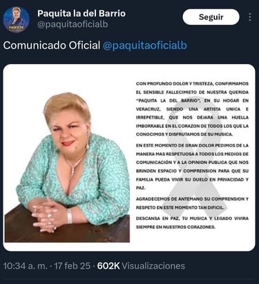 Paquita la del Barrio, famosa por sus letras cargadas de empoderamiento femenino, falleció rodeada de sus seres queridos. Figuras como "Rata de dos patas" y "Tres veces te engañé" se convirtieron en himnos de desamor y crítica al machismo, resonando en el corazón de muchos.