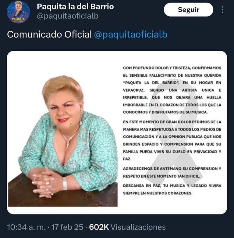 Hoy, 17 de febrero de 2025, el mundo de la música ranchera y popular mexicana despide a una de sus voces más emblemáticas. Francisca Viveros Barradas, conocida artísticamente como Paquita la del Barrio, falleció a los 77 años en su hogar en Veracruz, dejando un legado imborrable con canciones que han marcado generaciones.