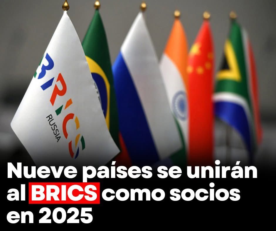 Nueve países se unirán al BRICS como socios en 2025 A partir del 1 de enero de 2025, nueve países se unirán al #BRICS como socios: Bolivia, Bielorrusia, Cuba, Uganda, Uzbekistán, Indonesia, Kazajistán, Malasia y Tailandia. Cancillería rusa: Tenemos previsto establecer una estrecha cooperación con los Estados socios con el fin de implicarlos lo más eficazmente posible en la cooperación dentro del grupo. Desde el Ministerio de Asuntos Exteriores ruso indicaron también que cuatro países más fueron invitados a unirse al BRICS en calidad de socios.