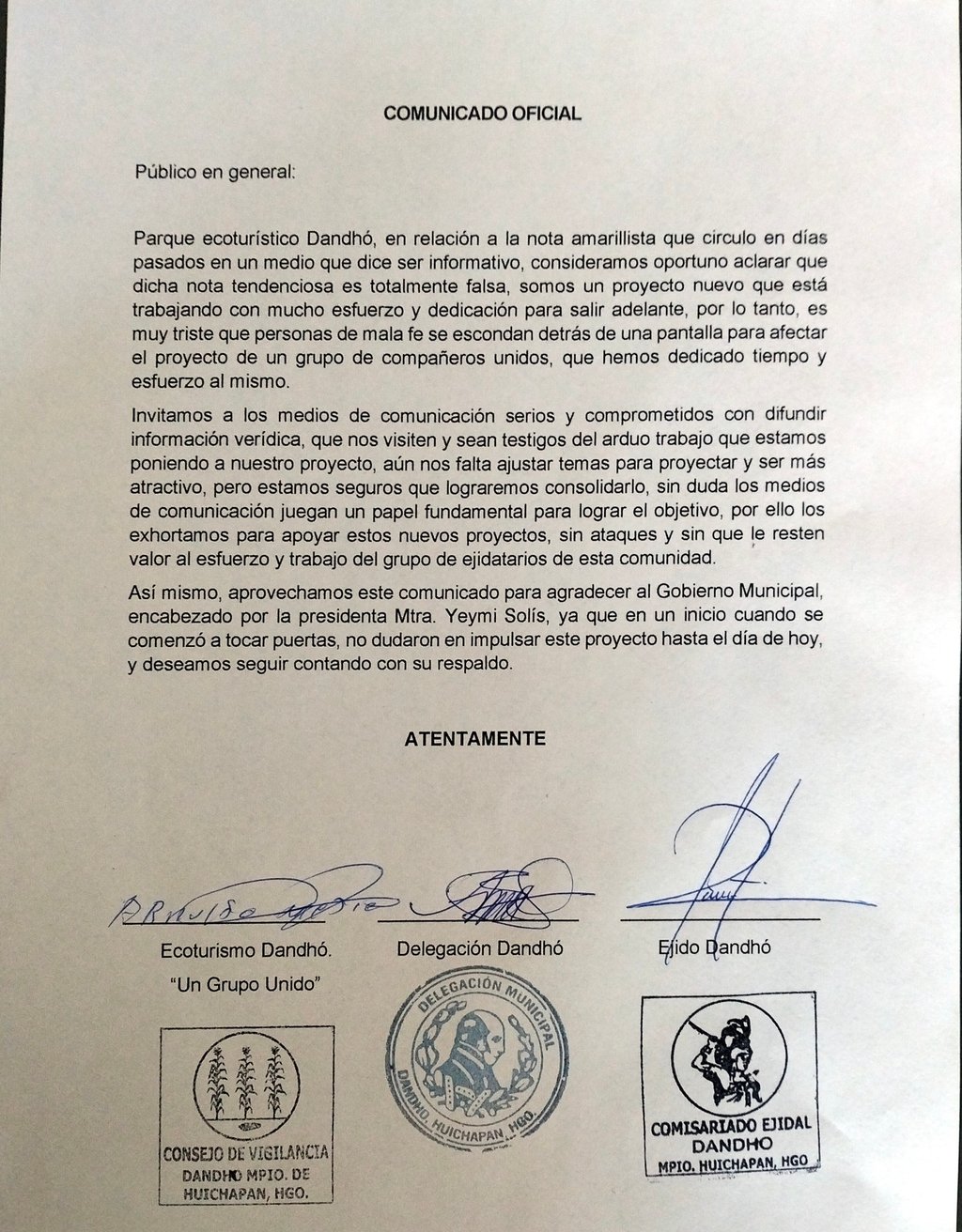 El centro ecoturístico indígena "Dandhó", ubicado en Huichapan, Hidalgo, emitió un contundente comunicado oficial a través de su página de Facebook para desmentir información falsa que circula en redes sociales y en páginas anónimas de corte amarillista. Estas publicaciones buscan desprestigiar el esfuerzo colectivo de la comunidad indígena que, con dedicación y compromiso, trabaja diariamente para posicionar a “Dandhó” como un modelo de desarrollo comunitario y turismo sostenible.