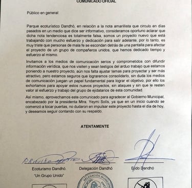 En su mensaje, las autoridades del Dandhó denunciaron los ataques malintencionados realizados desde el anonimato, los cuales afectan no solo la imagen del proyecto, sino también la reputación y el arduo trabajo de los habitantes que, con orgullo, han transformado este centro ecoturístico en un símbolo de identidad y esfuerzo comunitario.