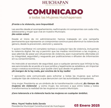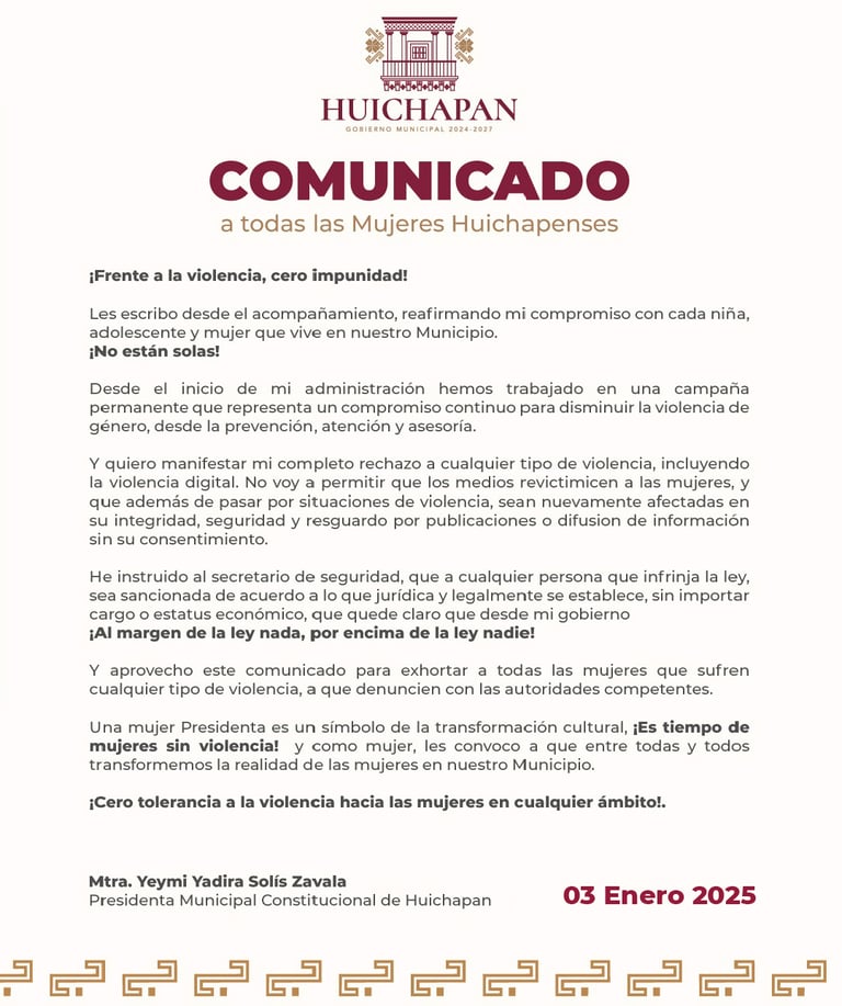 La presidenta municipal, Yeymi Solís Zavala, destacó en un comunicado que su administración no tolerará actos que vulneren los derechos humanos y reiteró su postura de que "nadie está por encima de la ley", sin importar su cargo o posición y reafirma su compromiso con cada niña, adolescente o mujer huichapense. La mandataria, reconocida por su enfoque en la transparencia y el fortalecimiento de valores éticos en la función pública, enfatizó que este caso será llevado ante las autoridades correspondientes para garantizar que se haga justicia.